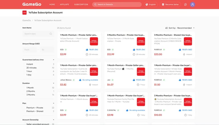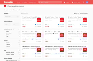 In addition to the Recharge service mentioned earlier (which is ideal for users who need full permissions and plan to use Premium long-term), you can also visit the Marketplace page on the GamsGo homepage to find sellers offering short-term plans or more flexible durations.