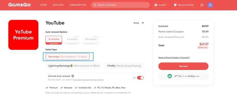 But if you purchase through the YouTube Premium marketplace on GamsGo, that concern basically disappears. Gamsgo offers Premium at a price far lower than the official rate while still giving you the exact same full benefits.